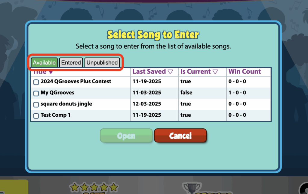 Last, you’ll choose the song you’d like to enter. You will be taken to a pop-up with all your created songs listed. There are three tabs for filtering the songs: Available, Entered, and Unpublished.