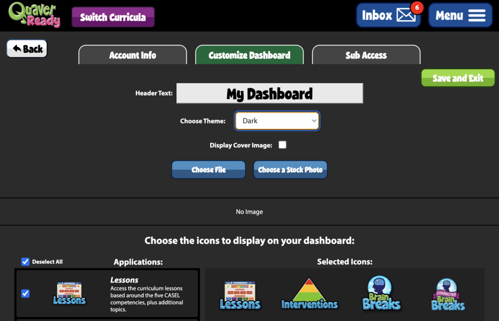 The QuaverReady Dashboard is divided into two sections: the top section, which contains essential features and is set in place, and the customizable bottom section, which allows you to tailor the Dashboard to your specific needs. The dashboard’s header has a curriculum logo, a Switch Curricula button (if applicable), Inbox, and a Menu. Let’s dive in!