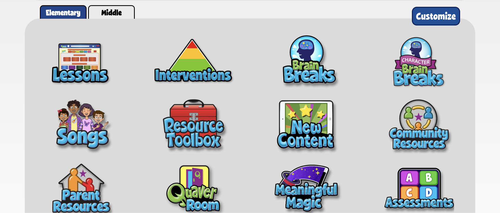 The QuaverReady Dashboard is divided into two sections: the top section, which contains essential features and is set in place, and the customizable bottom section, which allows you to tailor the Dashboard to your specific needs. The dashboard’s header has a curriculum logo, a Switch Curricula button (if applicable), Inbox, and a Menu. Let’s dive in!