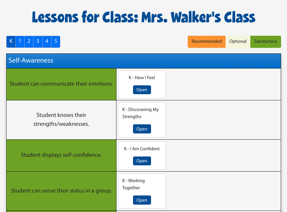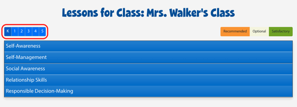 Lesson recommendations are based on survey outcomes and sorted into three categories. Lessons are color-coded in alignment with the range of recommended, optional, or satisfactory. Lessons are also sorted by competency and grade level. Select the grade level from the top left to filter recommendations.